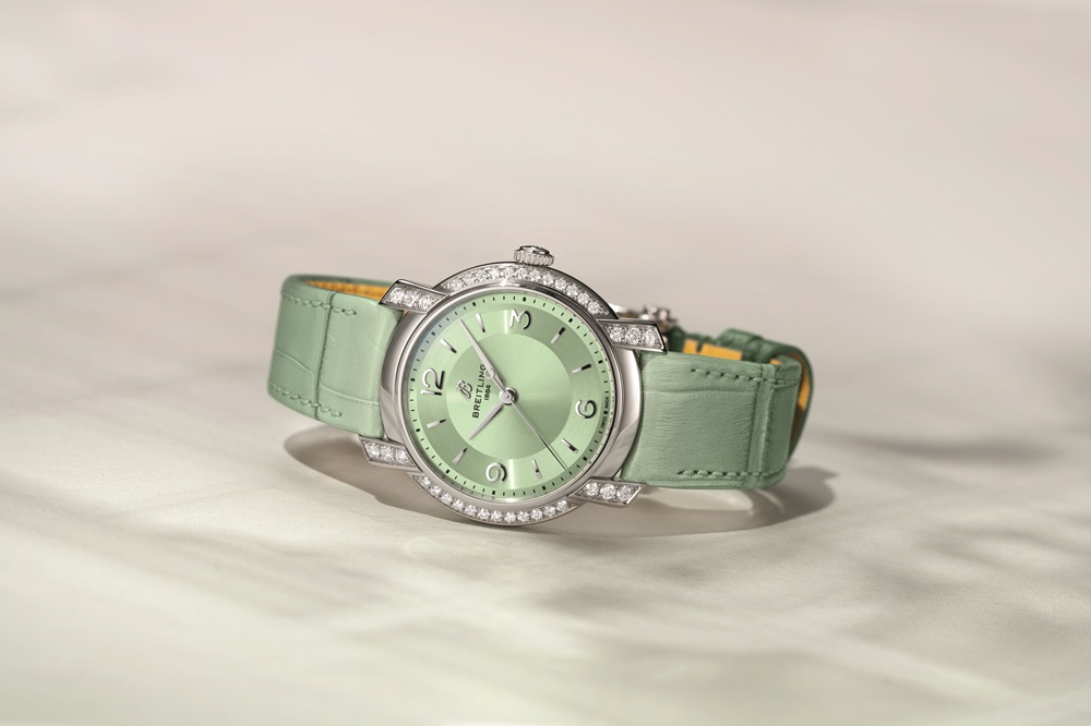 Os modelos automáticos de 36 mm em aço inoxidável apresentam cores vibrantes no mostrador e pulseiras de couro combinando, disponíveis em tons degradê de Berinjela, Sálvia e Cinza Claro. Uma versão em ouro 18 quilates é combinada com uma pulseira em cor Chocolate degradê. O relógio abriga o Calibre Breitling 10, certificado pelo COSC, um movimento automático com aproximadamente 42 horas de reserva de marcha.