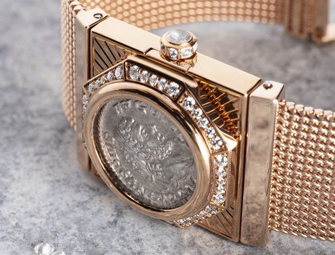 O relógio secreto Maglia Milanese Monete revisita a linha Monete, lançada pela Bvlgari em meados da década de 1960. Adornado com uma autêntica moeda antiga de 198-297 d.C., representando o Imperador Caracalla, ele personifica a inspiração de estilo ilimitada que a Antiguidade continua a proporcionar à Maison. Pela primeira vez na Bvlgari, o Maglia Milanese Monete explora a arte tradicional da malha milanesa, expressa aqui com uma flexibilidade magistral.