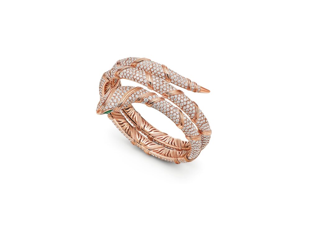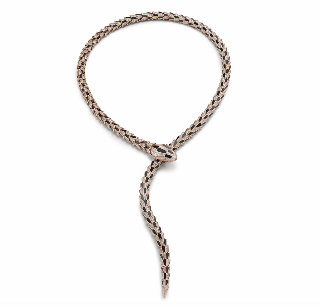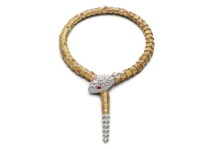 A seleção reúne algumas das expressões mais emblemáticas da casa romana. A coleção Serpenti, um dos símbolos mais reconhecidos da Bvlgari, aparece em interpretações que exploram diferentes metais e configurações, com destaque para versões que incorporam rubis e diamantes em composições de alta complexidade técnica. Entre elas, uma releitura que aproxima a serpente de elementos mitológicos, em peças modulares que transitam entre colar e pulseira.