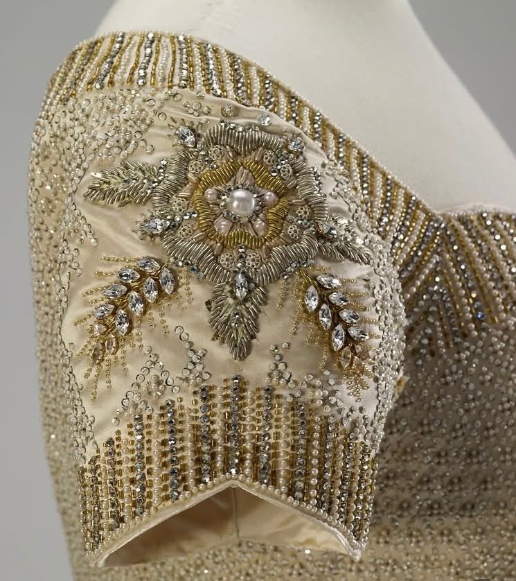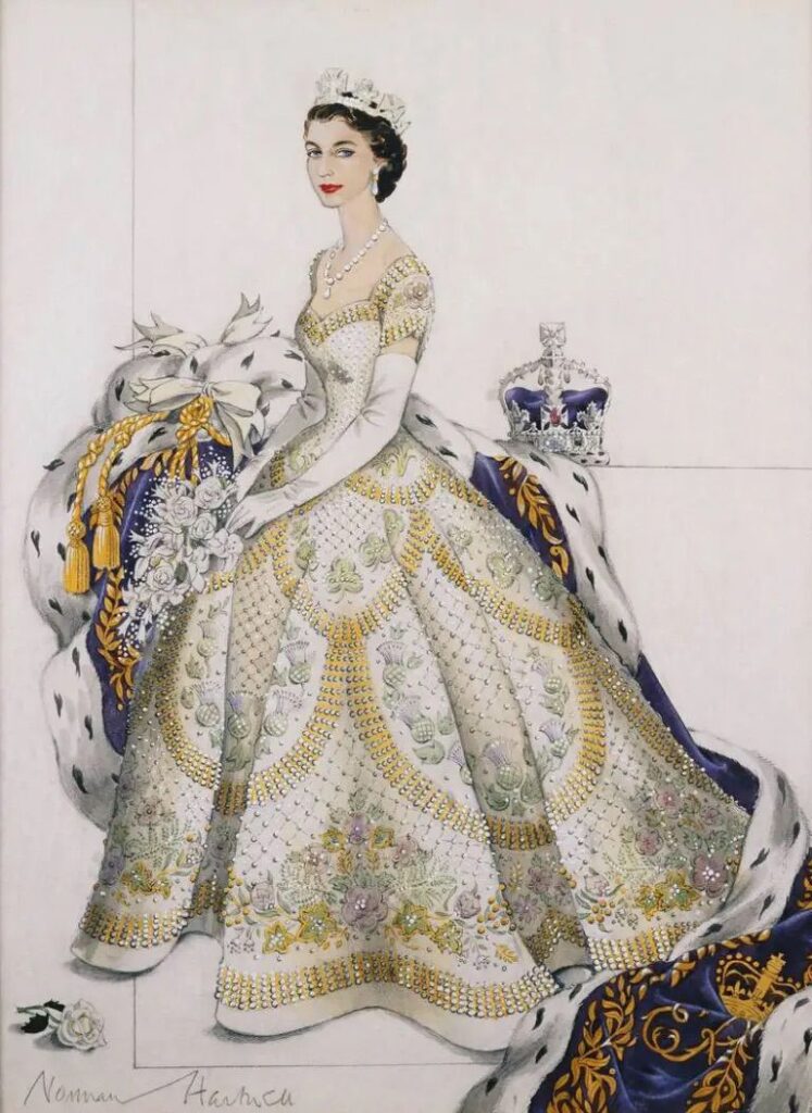 Dentro desse conjunto, o vestido de coroação, criado por Norman Hartnell para a cerimônia de 1953, ocupa um lugar central ao condensar de forma precisa esse modelo de construção, estruturado em cetim branco e coberto por um bordado elaborado que incorpora emblemas florais associados aos países da Commonwealth, distribuídos em uma composição que organiza uma narrativa coletiva diretamente sobre o corpo.