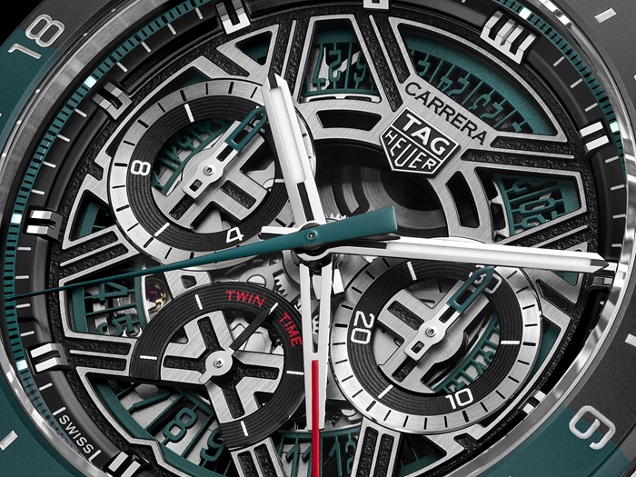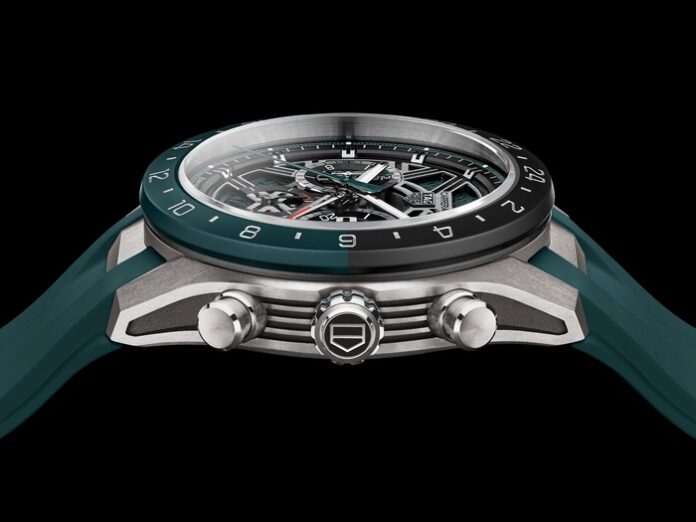 Esta é a primeira vez que a função GMT é incorporada à linha TAG Heuer Carrera Extreme Sport, e ela chega com uma forte identidade visual. O verde azulado (teal green) consolida-se agora como a cor característica dos modelos GMT dentro da coleção TAG Heuer Carrera, aparecendo de forma marcante na pulseira de borracha, no ponteiro central, nos detalhes do mostrador e no disco de data vazado, que conta com Super-LumiNova branca para melhor legibilidade noturna.