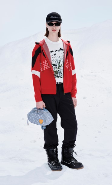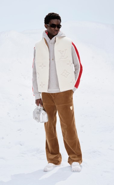 Malhas, jeans bordados com paetês e artigos em couro com o padrão Monogram Miroir homenageiam a estética retrofuturista dos baús Louis Vuitton. O shearling aparece em bolsas icônicas revisitadas, e modelos esportivos em denim acompanham tanto aventuras nas montanhas quanto escapadas urbanas. A linha é complementada por acessórios como gorros, cachecóis e máscaras de ski com lentes Monograma, traduzindo o espírito alpino para todos os momentos do dia.