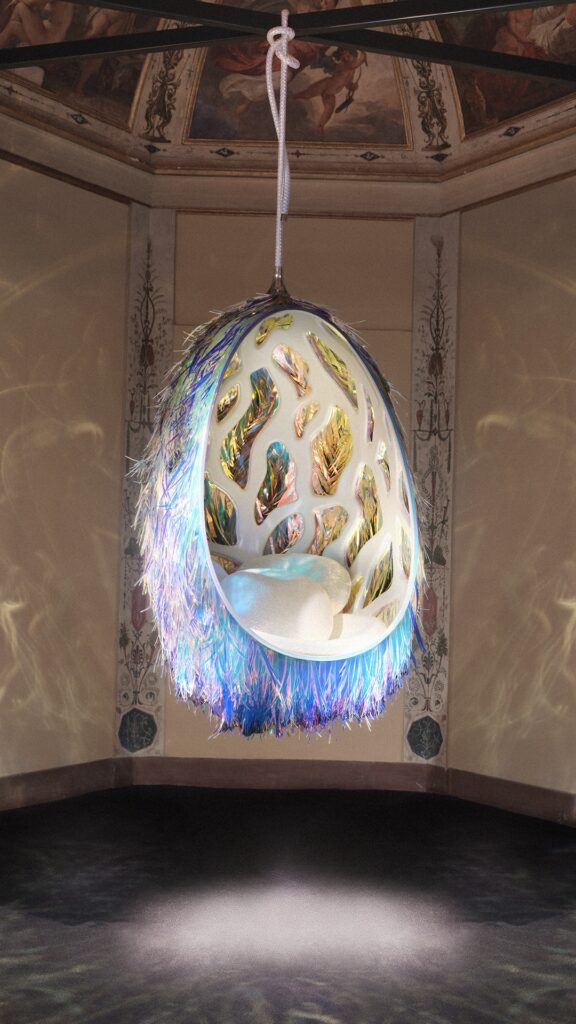 A exposição avança ainda para um território mais experimental, com criações assinadas pelo Estudio Campana, que introduzem elementos lúdicos e quase surrealistas, como um pebolim habitado por figuras mitológicas e um gabinete revestido em marchetaria de couro exótico. Em paralelo, o estúdio Raw Edges apresenta uma poltrona que explora ilusões ópticas, sugerindo um novo entendimento de conforto a partir da percepção visual.
