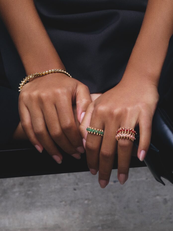 A mudança mais evidente está na paleta. Ágatas em vermelho e verde, calcedônia rosa e ônix passam a integrar as peças, trazendo uma presença cromática mais marcada. Essas pedras surgem em esferas que se alternam com as tachas metálicas, elemento icônico de Clash, criando uma composição que explora ritmo, textura e profundidade visual de forma mais acentuada.