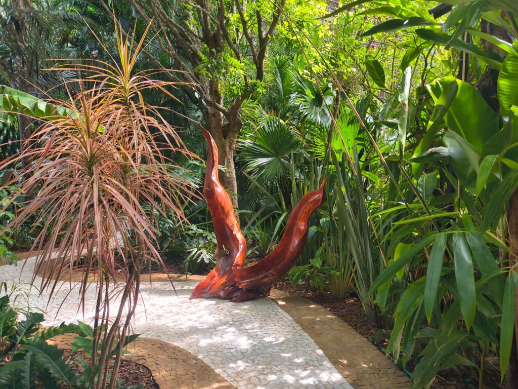“Impressões da Terra” reúne 14 esculturas desenvolvidas a partir de madeira de reaproveitamento, em um conjunto que ocupa o espaço como se sempre tivesse pertencido a ele. Não há ruptura visual. Ao contrário, as obras parecem emergir do próprio jardim, dissolvendo os limites entre intervenção artística e paisagem natural.