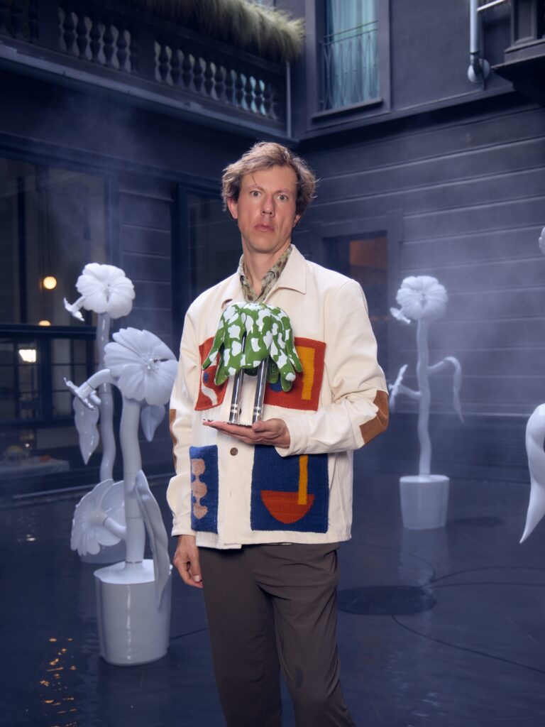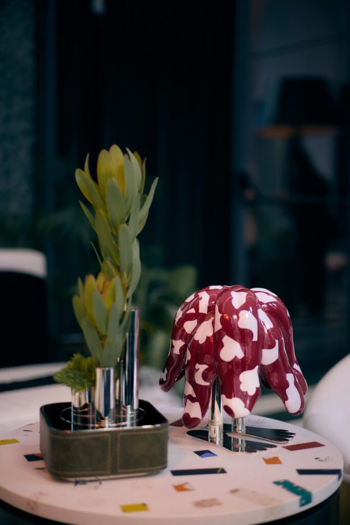 No centro da instalação está a coleção Cafuné, desenvolvida em colaboração com a Bosa Ceramiche. As peças exploram o diálogo entre metal e cerâmica em formas escultóricas, reforçando uma tendência recorrente no design contemporâneo de valorização da materialidade como linguagem expressiva. Aqui, os objetos deixam de ser utilitários para assumir um papel quase artístico, com forte apelo tátil e visual.