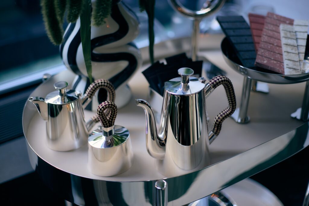 A narrativa se desdobra em outros ambientes da instalação. Um tea room introduz uma camada mais íntima da experiência, onde a coleção Rapunzel ganha novos desdobramentos. Itens como bules, leiteiras, açucareiros e carrinhos de bar ampliam a linha e reforçam a assinatura estética de Cibic, marcada por um equilíbrio entre ludicidade e sofisticação.