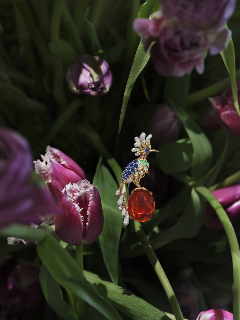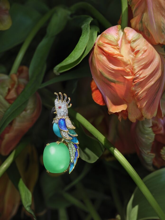 Nos capítulos dedicados às aves, como Paradise Bird e Parrot, a abordagem ganha contornos mais experimentais. Broches com combinações inusitadas de pedras, esmaltação detalhada e composições cromáticas complexas ampliam o repertório visual da coleção, afastando-se de uma leitura clássica e aproximando-se de uma linguagem mais artística.